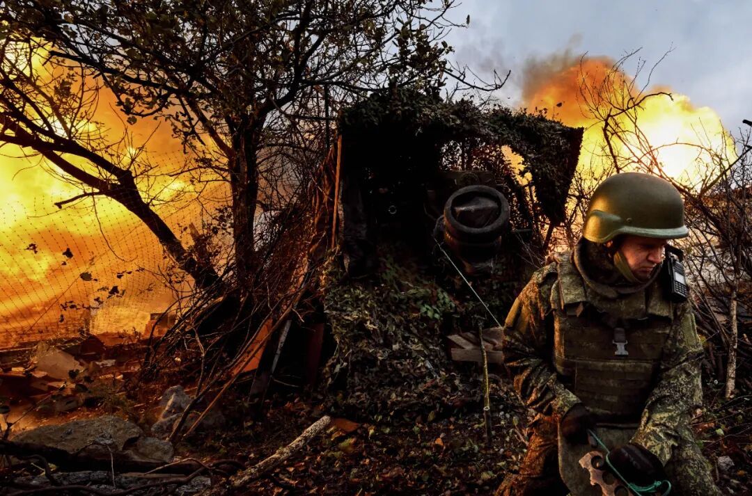 10月21日,顿涅茨克地区,俄军士兵向波克罗夫斯克方向的乌克兰阵地发射自行榴弹炮。图/视觉中国